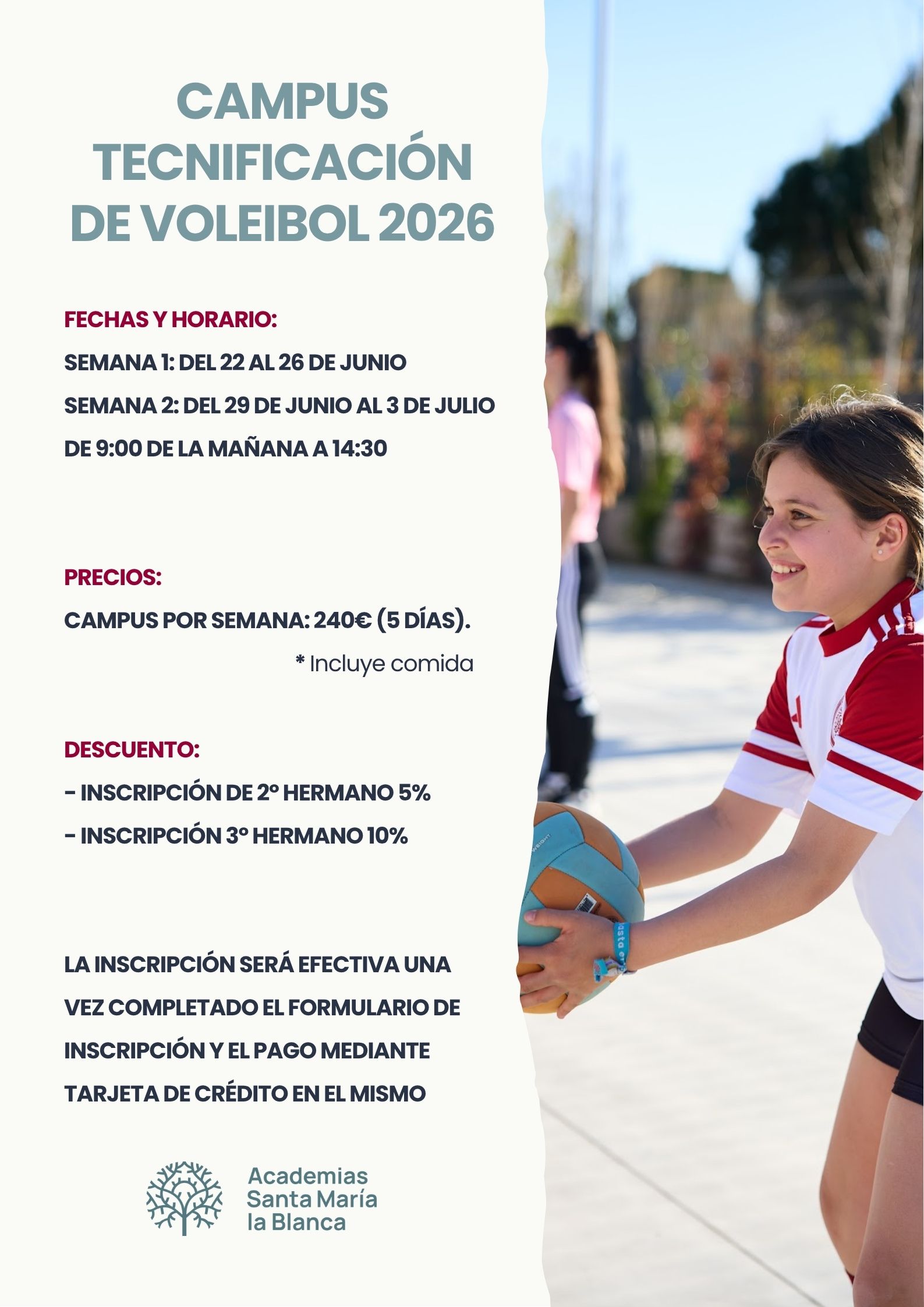 Desde el equipo de Academias, se organiza  el campus de tecnificación de voleibol para el fin de este curso 25/26. Se centrará en una mejora individual de la técnica y la táctica del jugador.