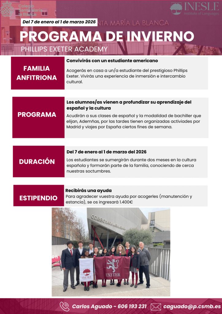 El Departamento de Internacionalización de Santa María la Blanca abre la convocatoria para familias anfitrionas que deseen acoger a un estudiante americano del prestigioso Phillips Exeter Academy durante su estancia en Madrid, del 17 de enero al 1 de marzo de 2026.