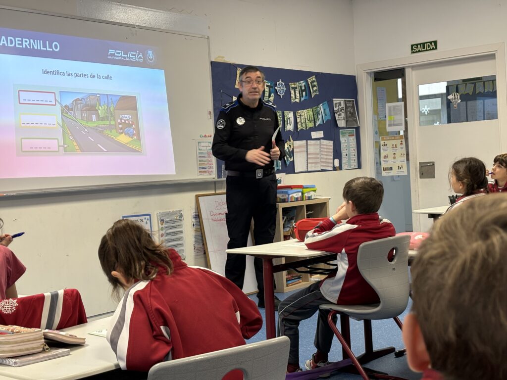 Las sesiones fueron impartidas por un agente de policía municipal de Madrid, que supo conectar desde el primer momento con los niños y niñas a través de explicaciones claras, ejemplos cercanos y un lenguaje adaptado a su edad. Durante las charlas, el alumnado aprendió normas básicas de circulación, el significado de las señales más habituales y la importancia de comportarse de manera responsable tanto como peatones como futuros conductores de bicicletas o patinetes.